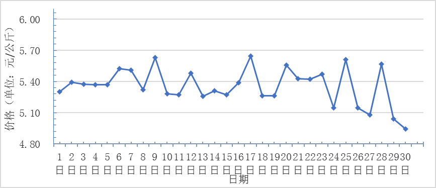 4月,全國重點(diǎn)監(jiān)測(cè)農(nóng)產(chǎn)品批發(fā)市場(chǎng)香蕉總交易量達(dá)3.1萬噸,同比增長14.8%,環(huán)比增長14.8%;總交易價(jià)值16535萬元,同比下降14.2%,環(huán)比增長15.6%。日平均價(jià)格最高為5.7元/千克,最低為5.0元/千克,全月平均價(jià)格為5.4元/千克,同比下降15.6%,環(huán)比增長1.9%(每日價(jià)格變化如圖)。