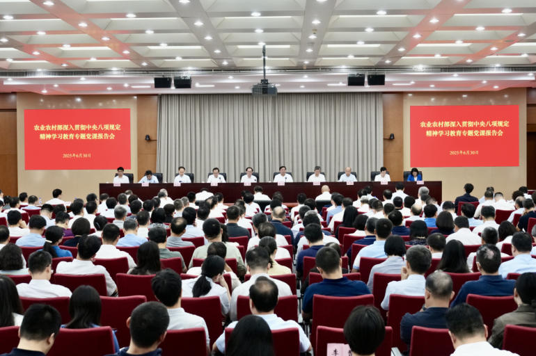 6月30日,農(nóng)業(yè)農(nóng)村部黨組召開(kāi)深入貫徹中央八項(xiàng)規(guī)定精神學(xué)習(xí)教育專題黨課報(bào)告會(huì),部黨組書(shū)記、部長(zhǎng)韓俊作專題黨課報(bào)告,中央第四指導(dǎo)組組長(zhǎng)車俊、副組長(zhǎng)郝平到會(huì)指導(dǎo)。會(huì)議強(qiáng)調(diào),部系統(tǒng)各級(jí)黨組織和廣大黨員干部要深入學(xué)習(xí)貫徹習(xí)近平總書(shū)記關(guān)于加強(qiáng)黨的作風(fēng)建設(shè)的重要論述,落實(shí)中央部署和中央指導(dǎo)組要求,持續(xù)推動(dòng)學(xué)習(xí)教育走深走實(shí),持之以恒深化部系統(tǒng)作風(fēng)建設(shè),營(yíng)造風(fēng)清氣正的良好政治生態(tài),為推進(jìn)鄉(xiāng)村全面振興、加快建設(shè)農(nóng)業(yè)強(qiáng)國(guó)提供堅(jiān)強(qiáng)保障。