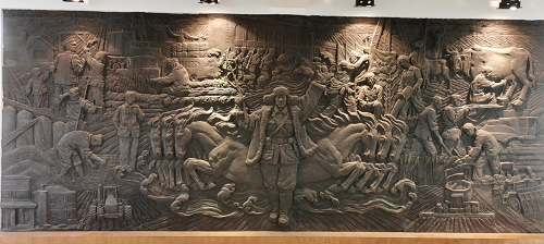 場(chǎng)史館主題銅質(zhì)浮雕由中央美院壁畫系教師杜飛制作,位于館中心,與正門相對(duì),長(zhǎng)6米,高2米。浮雕以“十六掛馬車建場(chǎng)”為主題,集中反映了農(nóng)場(chǎng)艱苦創(chuàng)業(yè)、奮斗、勇于開(kāi)拓的輝煌歷程。