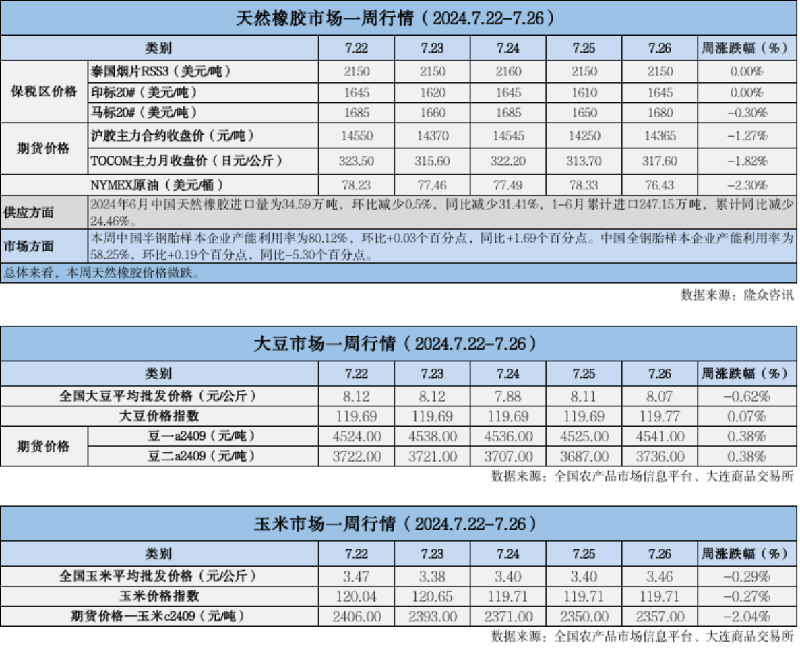 天然橡膠、大豆、玉米市場(chǎng)一周行情(2024.07.22-07.26)