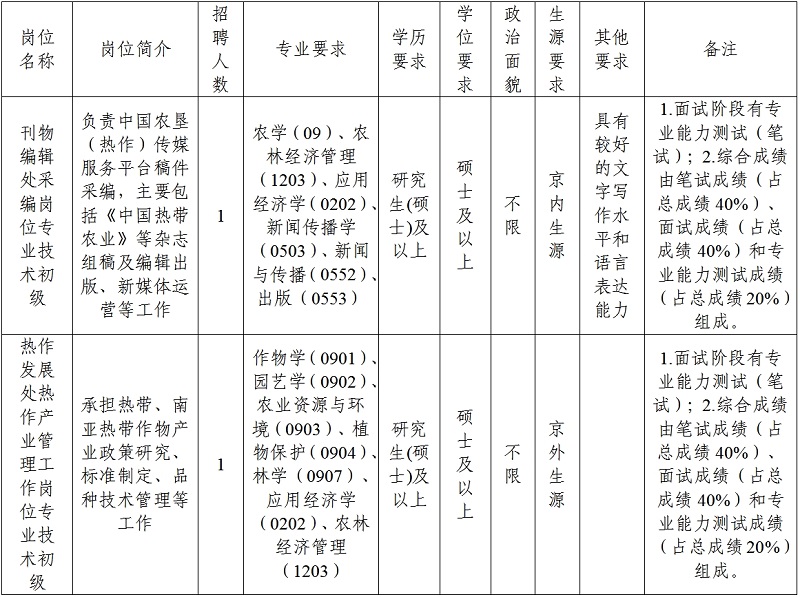 根據(jù)農(nóng)業(yè)農(nóng)村部在京單位2025年度公開招聘應(yīng)屆高校畢業(yè)生工作的統(tǒng)一安排,現(xiàn)就中國農(nóng)墾經(jīng)濟(jì)發(fā)展中心(農(nóng)業(yè)農(nóng)村部南亞熱帶作物中心)2025年度公開招聘應(yīng)屆高校畢業(yè)生有關(guān)事項(xiàng)補(bǔ)充公告如下: