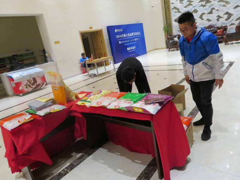 2018年9月19日晚,在吉林東福米業(yè)劇場(chǎng)門廳的產(chǎn)品展示區(qū),公司營銷中心經(jīng)理高志豐同志正帶著本部門的兩名員工,精心地布置著展臺(tái)。他將兩個(gè)布展桌作“L”型擺放,并鋪好紅色絨布,按照產(chǎn)品品種、規(guī)格,分類擺好,放好企業(yè)宣傳手冊(cè)。這些工作,都是為第二天的“2018吉林首屆農(nóng)民豐收節(jié)暨吉林大米品牌發(fā)展論壇”活動(dòng)準(zhǔn)備的。