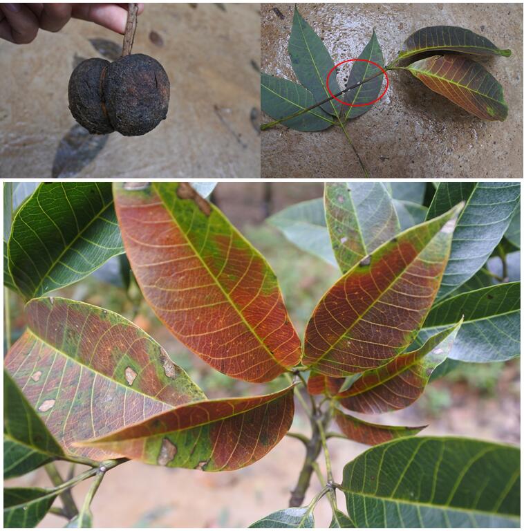 季風(fēng)性落葉病果、葉片及葉柄癥狀
