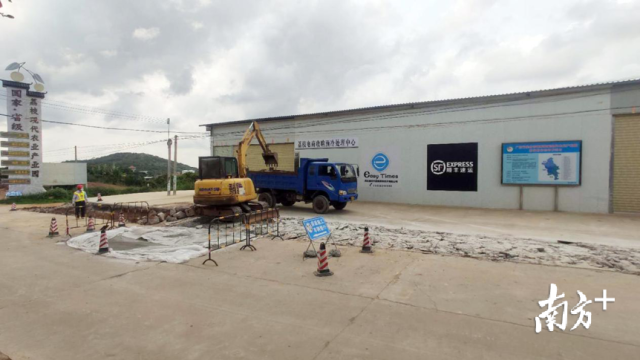 高州市根子鎮(zhèn)易時代荔枝電商產(chǎn)品處理中心前工人們正對路面進(jìn)行修整
