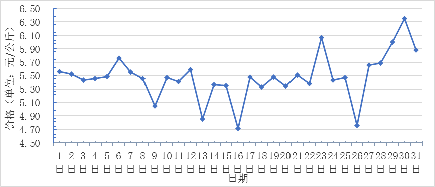 1月,全國重點監(jiān)測農(nóng)產(chǎn)品批發(fā)市場香蕉總交易量達 2.1萬噸,同比下降12.5%,環(huán)比下降12.5%;總交易價值11082.4萬元,同比下降46.3%,環(huán)比下降17.5%。日平均價格最高為6.4元/千克,最低為4.7元/千克,全月平均價格為5.5元/千克,同比上漲3.8%,環(huán)比下降9.8%(每日價格變化如圖)。