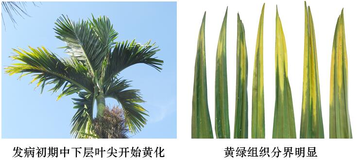 三、及時清理病株。及時清除樹冠最下部病葉枯葉;對于整個樹冠葉片都黃化甚至枯死,或樹冠縮小一半以上甚至枯頂?shù)牟≈?,?yīng)整株清除。發(fā)病率達(dá)70%以上的特重檳榔黃化病園,建議全園更新。