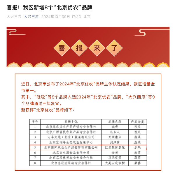 “紅星集體農(nóng)莊”入選2024 年“北京優(yōu)農(nóng)”品牌