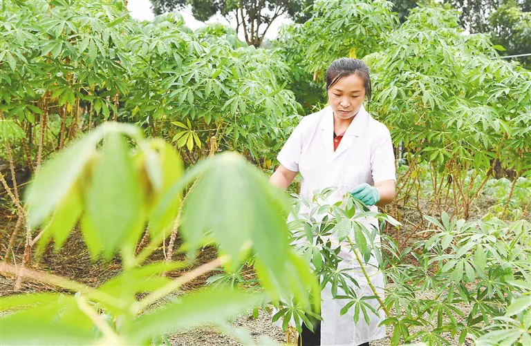 中國熱帶農(nóng)業(yè)科學院科研人員查看木薯生長情況。新華社發(fā)