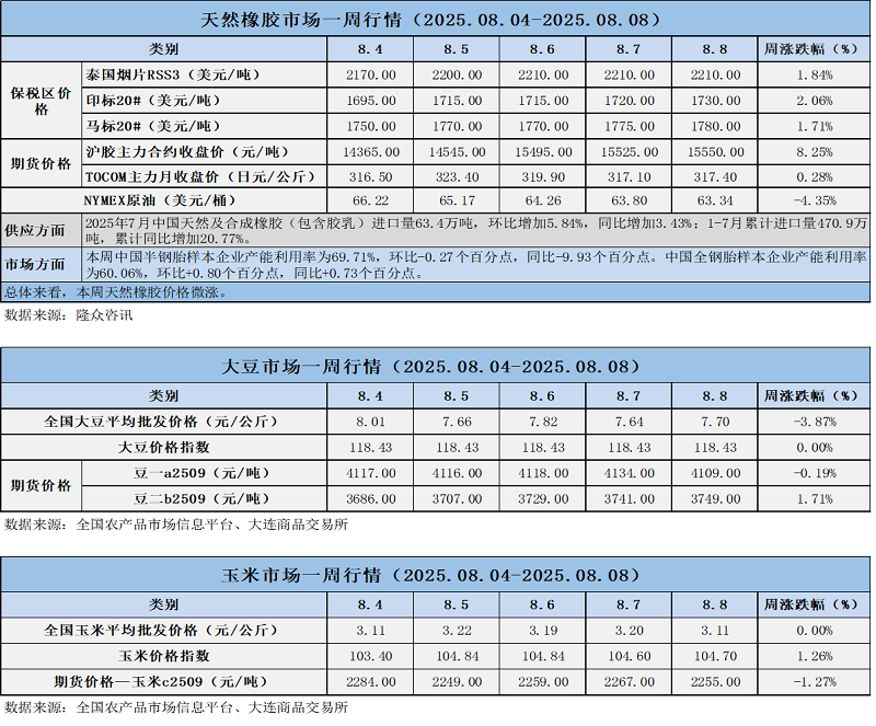 天然橡膠、大豆、玉米市場(chǎng)一周行情(2025.08.04-08.08)