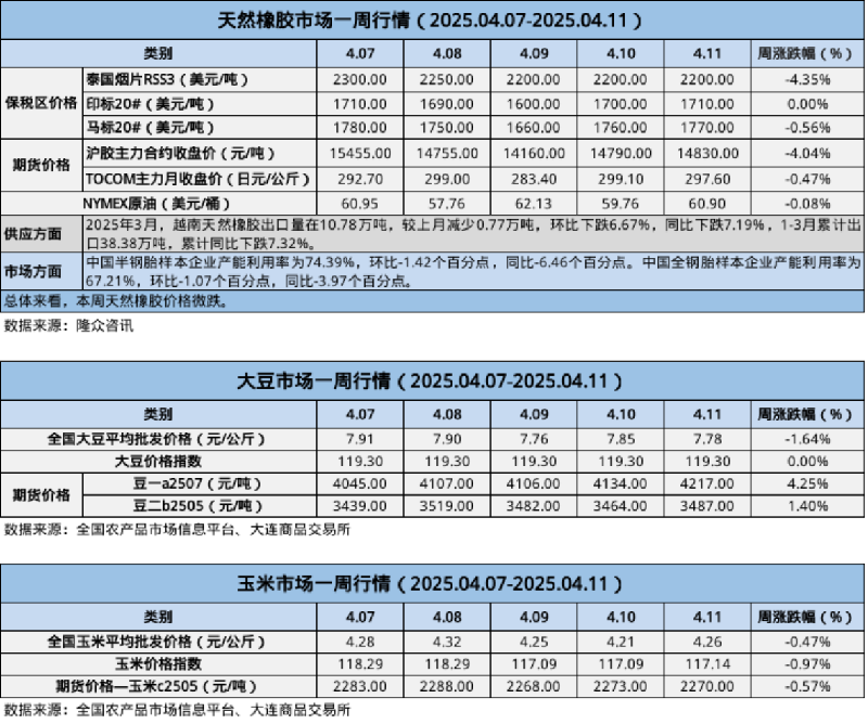 天然橡膠、大豆、玉米市場(chǎng)一周行情(2025.04.07-04.11)