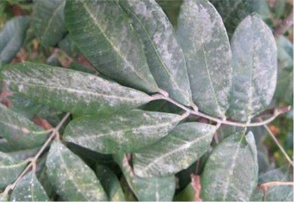 白霉病主要為害接近成熟的龍眼果實及葉片,嚴重時在病果和病葉表面覆蓋一層白色霉狀物,導致部分果枝干枯、葉片早衰、果實脫落或果皮暗褐色、果肉變質腐爛;中度和輕度發(fā)病的果實,雖果肉未腐爛,但品質與風味下降(圖1)。受果園地面高濕度和樹冠枝葉密集影響,該病往往先發(fā)生在樹冠中下層枝葉稠密的果穗或葉片上。因此,建議各龍眼產區(qū)主管生產的技術人員或果園主加強踏查,監(jiān)測病情發(fā)展,發(fā)病果穗超過5%的龍眼果園應進行噴藥防治。果實發(fā)育距采摘10天以上,可噴灑25%咪鮮胺(施???乳油1500倍液,或45%咪鮮胺(施???水乳劑2000-2500倍液,或43%氟菌•肟菌酯(露娜森)懸浮劑,或60%唑酯•代森聯(lián)(百泰)水分散粒劑 1000-1500 倍,或560克/升嘧菌•百菌清(阿米多彩)懸浮劑1000倍1-2次,間隔7-10天;若發(fā)病龍眼園的果實接近采收,即距離采摘收獲不足10天,可噴灑25%咪鮮胺(施???乳油1500倍液或45%咪鮮胺(施???水乳劑2000-2500倍液1次,確保龍眼果品安全。