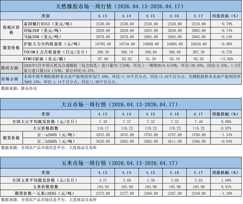 天然橡膠、大豆、玉米市場一周行情(2026.04.13-04.17)