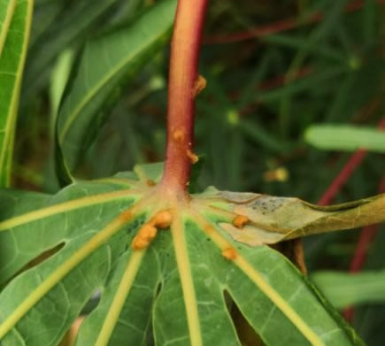 (三)監(jiān)測(cè)防控。加強(qiáng)木薯苗期病害監(jiān)測(cè),發(fā)現(xiàn)葉片上出現(xiàn)角形病斑或水浸狀病斑時(shí),可用乙蒜素進(jìn)行防治。對(duì)于莖基部出現(xiàn)大量白色至黃褐色溢出物的重病植株,應(yīng)拔除補(bǔ)種。