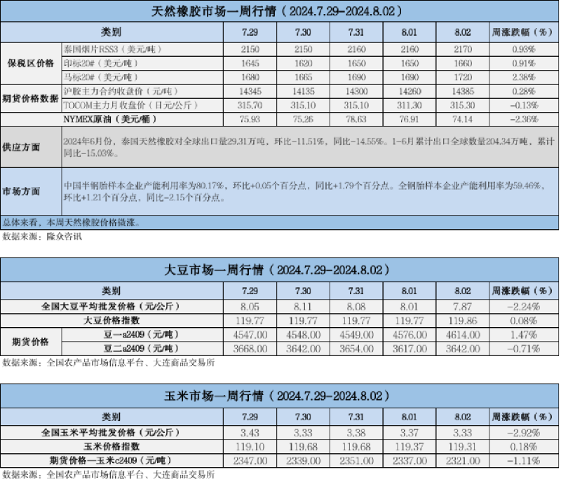 天然橡膠、大豆、玉米市場一周行情(2024.07.29-08.02)