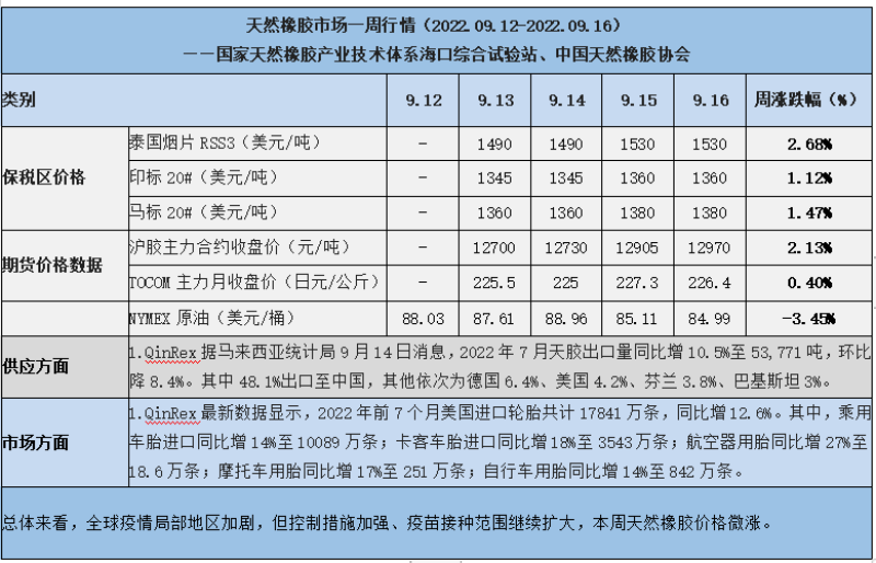 天然橡膠、大豆、玉米市場一周行情(2022.09.12-09.16)