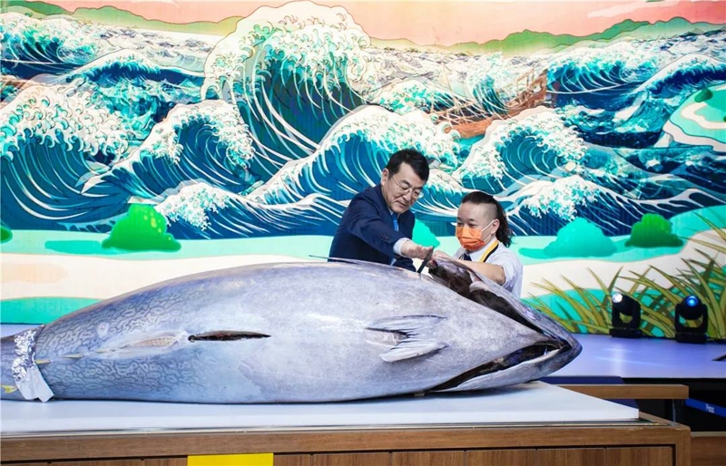 是明芳為“藍鰭金槍魚開魚秀”開啟第一刀。