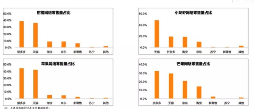 同時(shí),在蘋(píng)果、柑橘、芒果品類的網(wǎng)絡(luò)零售量分布中,來(lái)自拼多多等新電商平臺(tái)的渠道占比分別達(dá)44.35%、38.6%、32.2%,均排名第一。在“網(wǎng)紅單品”小龍蝦品類中,傳統(tǒng)電商平臺(tái)仍占絕對(duì)優(yōu)勢(shì),但新電商平臺(tái)消費(fèi)增長(zhǎng)迅速,渠道占比已躍居第二。