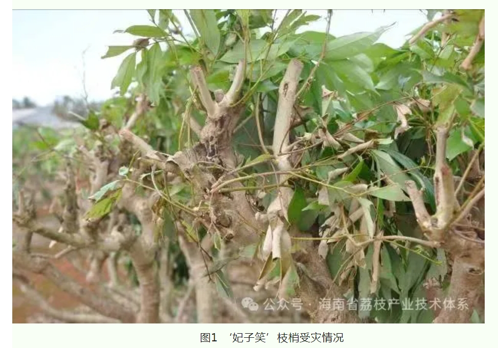 荔枝枝梢生長期正值海南的雨季,臺(tái)風(fēng)活動(dòng)頻繁。荔枝營養(yǎng)生長期遭遇強(qiáng)風(fēng)暴雨易造成葉片破損、樹枝折斷,甚至整株倒伏,對(duì)荔枝來年的產(chǎn)量形成造成嚴(yán)重影響,為有效應(yīng)對(duì)臺(tái)風(fēng)災(zāi)害對(duì)荔枝生產(chǎn)造成的不利影響,提出如下建議: