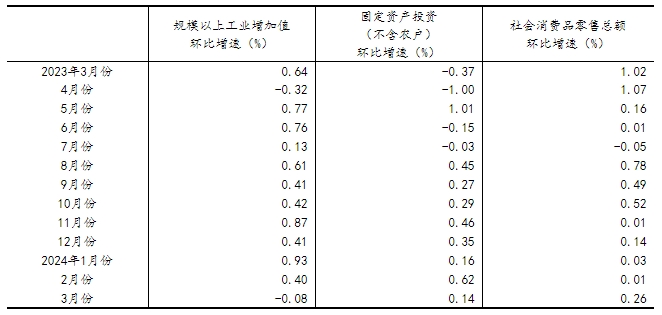 (2)根據(jù)季節(jié)調(diào)整模型自動(dòng)修正結(jié)果,對(duì)近一年來(lái)各期國(guó)內(nèi)生產(chǎn)總值、規(guī)模以上工業(yè)增加值、固定資產(chǎn)投資(不含農(nóng)戶)、社會(huì)消費(fèi)品零售總額環(huán)比增速進(jìn)行修訂。修訂結(jié)果及2024年一季度GDP環(huán)比數(shù)據(jù)、2024年3月份其他指標(biāo)環(huán)比數(shù)據(jù)如下: