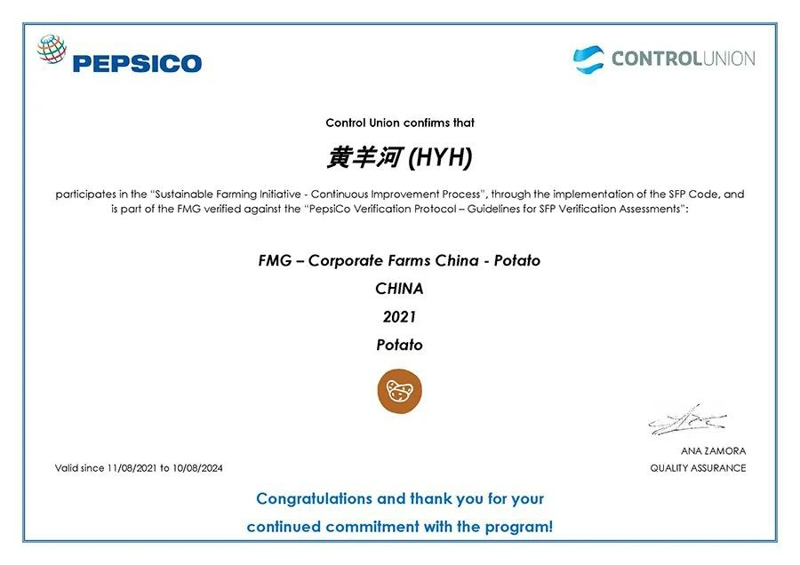 近日,甘肅農(nóng)墾黃羊河集團(tuán)公司榮獲百事公司“可持續(xù)發(fā)展農(nóng)業(yè)項(xiàng)目(簡(jiǎn)稱(chēng)“SFP”)中國(guó)馬鈴薯農(nóng)場(chǎng)”認(rèn)證,認(rèn)證有效期3年。