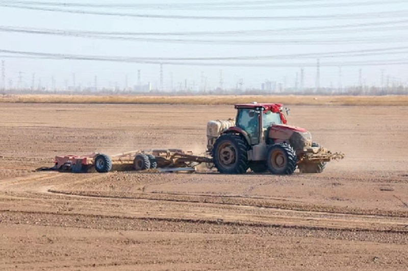 圖為寧夏農(nóng)墾前進(jìn)農(nóng)場(chǎng)正在開展聯(lián)合整地作業(yè)?!£惓俊z