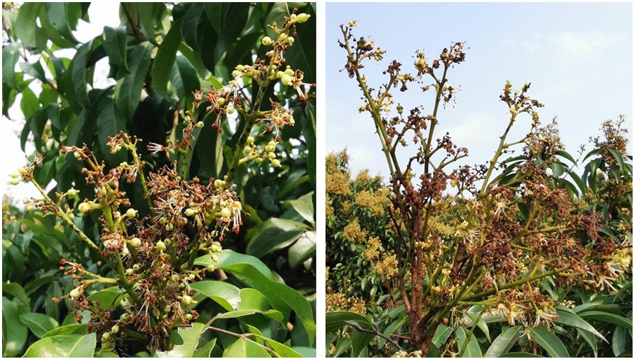 當前,廣東、廣西以及福建的大多數(shù)主栽荔枝品種處于盛花期或即將進入盛花期。荔枝花期如同果實轉色至成熟期,易感染霜疫病和炭疽病,有效防控花期病害是確保荔枝豐收的一個重要環(huán)節(jié)。據監(jiān)測站調查,因本月中旬華南地區(qū)連續(xù)數(shù)天的陰雨天氣,導致部分果園的荔枝花穗感染了霜疫?。▓D1)。據中國天氣網22日預報,江南、華南一帶的強對流天氣出場頻率明顯增加,預計3月下旬南方還將有兩次降雨過程,分別在24日夜間至27日以及29日前后,降水量較常年同期偏多。監(jiān)測站和荔枝主產區(qū)生產主管部門要積極開展監(jiān)測,指導果農及時開展防控。