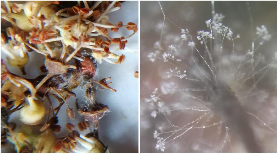 圖2 室溫下保濕一晚荔枝小花上長出的白色霉狀物(左)及病原菌繁殖體(右)
