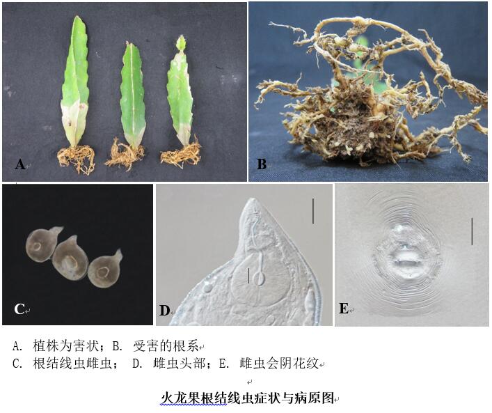 近期,病蟲害防控項目組專家在福建省漳州與泉州火龍果種植區(qū)調查發(fā)現根結線蟲為害火龍果。為害前期,植株地上部癥狀不明顯,受害嚴重時,地上部枝條生長緩慢,表皮由深綠色轉為黃綠色,莖肉縮水變扁,植株呈凋萎狀,受害根部??梢姶笮〔灰坏母Y,新根少;發(fā)病后期根系變褐、腐爛。鏡檢解剖根部可見乳白色或淺黃色的雌蟲寄生于根內,根外肉眼可見根結線蟲膠質狀的卵囊。經分離與鑒定,確定為害閩南火龍果根結線蟲的種為南方根結線蟲(Meloidogyne incongnita)和象耳豆根結線蟲(M. enterolobii)。其中,象耳豆根結線蟲是目前生產上重要病原線蟲,其寄主范圍廣、致病性強,近年來已在閩南地區(qū)多種作物和果樹上發(fā)現為害,應引起足夠重視,防止傳播擴散。因此,各監(jiān)測站和生產部門應引起重視,指導果農及時開展防治。項目組專家提出如下防控建議。