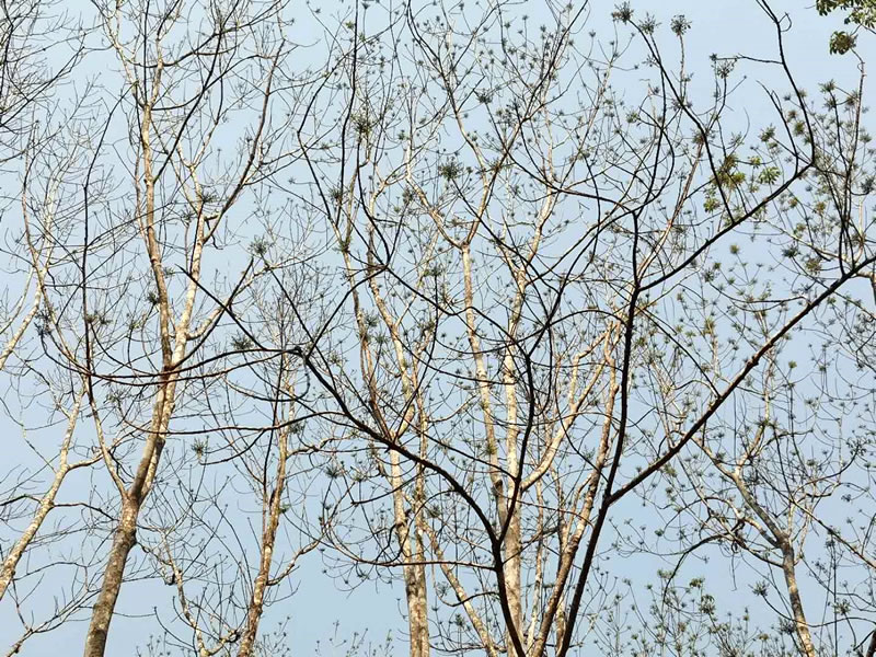 橡膠樹(shù)為應(yīng)對(duì)干旱逆境,通過(guò)不抽葉、只開(kāi)花不抽葉或者落葉、減少膠乳產(chǎn)量等自我防御機(jī)制來(lái)維持生長(zhǎng);同時(shí),高溫干旱環(huán)境條件非常有利于橡膠樹(shù)葉螨、介殼蟲等蟲(螨)害的發(fā)生。根據(jù)近期監(jiān)測(cè),版納、普洱片區(qū)除云南農(nóng)墾江城公司、西盟公司外,各監(jiān)測(cè)點(diǎn)均有橡膠樹(shù)因干旱出現(xiàn)不同程度的只開(kāi)花不抽葉、黃葉、落葉推遲開(kāi)割情況。主要發(fā)生在風(fēng)化石地段、低海拔的陽(yáng)坡林段。