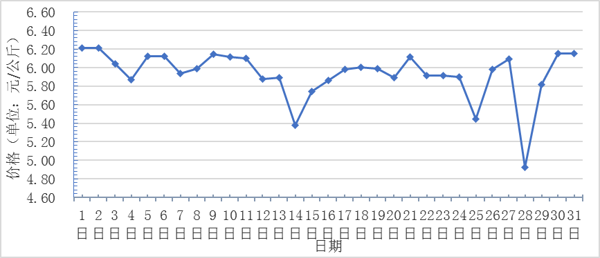 3月,全國重點監(jiān)測農(nóng)產(chǎn)品批發(fā)市場香蕉總交易量達2.2萬噸,同比下降18.5%,環(huán)比增長29.4%;總交易價值12278.1萬元,同比下降14.2%,環(huán)比增長24.8%。日平均價格最高為6.2元/千克,最低為4.9元/千克,全月平均價格為5.9元/千克,同比增長11.5%,環(huán)比下降0.5%(注:按環(huán)比平均價格按兩位小數(shù)計算)(每日價格變化如圖)。