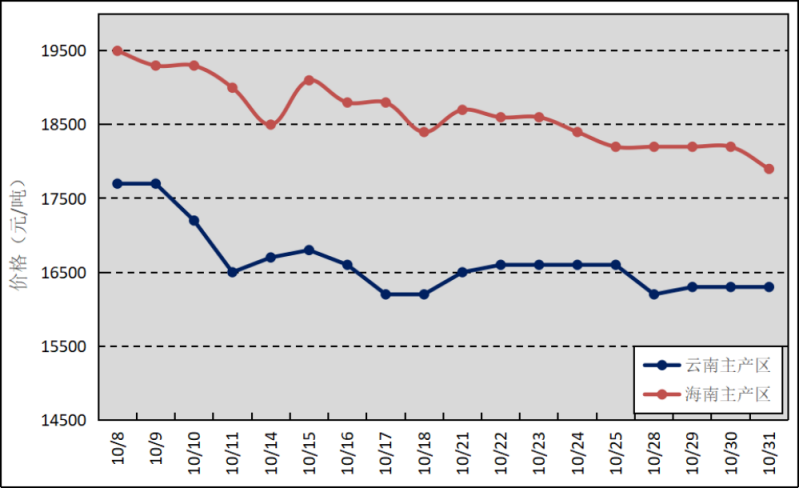 國內(nèi)主產(chǎn)區(qū):10月,除云南部分產(chǎn)區(qū)因季風(fēng)性落葉病暴發(fā)、海南部分產(chǎn)區(qū)受下旬降水?dāng)_動明顯增多影響割膠作業(yè)外,國內(nèi)大部分產(chǎn)區(qū)割膠工作正常開展,膠乳產(chǎn)量逐步增加。云南、海南鮮膠乳(折干膠)月均價格分別為16644元/噸、18650元/噸,環(huán)比上漲901元/噸、2845元/噸。
