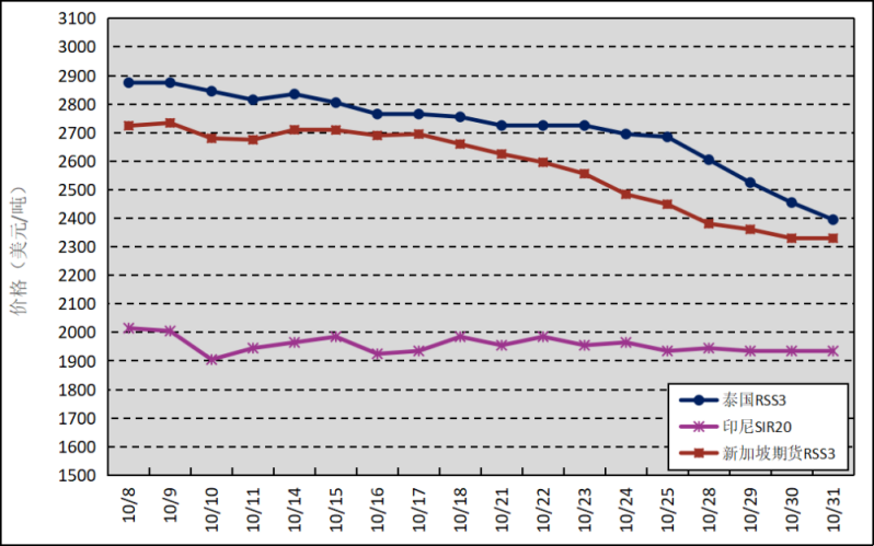 國外主產(chǎn)區(qū):10月,泰國RSS3平均價格為2715美元/噸,環(huán)比下跌68美元/噸,最高價為2875美元/噸,最低價為2395美元/噸;印尼SIR20平均價格為1956美元/噸,環(huán)比上漲77美元/噸,最高價為2015美元/噸,最低價為1905美元/噸;新加坡RSS3期貨主力合約月均結(jié)算價格為2577美元/噸,環(huán)比下跌128美元/噸,最高價為2734美元/噸,最低價為2330美元/噸。