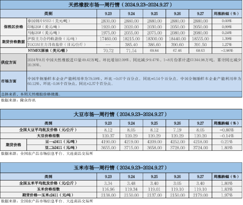 天然橡膠、大豆、玉米市場一周行情(2024.09.23-09.27)