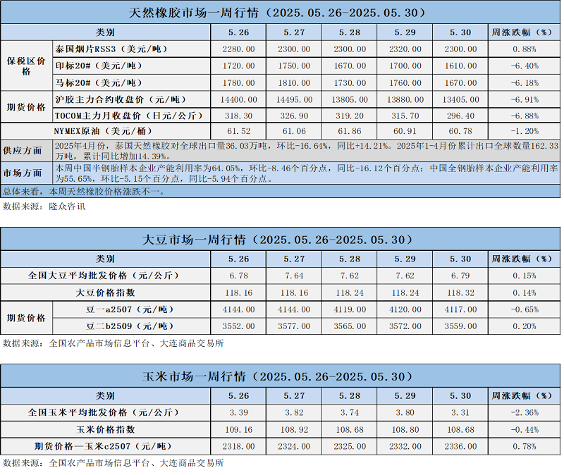 天然橡膠、大豆、玉米市場一周行情(2025.05.26-05.30)
