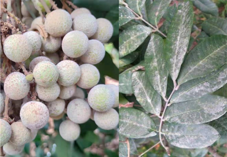 廣東與廣西是我國龍眼的重要主產(chǎn)區(qū),現(xiàn)正陸續(xù)進入采收旺季。今年夏季持續(xù)高溫高濕,導(dǎo)致部分果園龍眼白霉病發(fā)生嚴(yán)重。該病主要為害接近成熟的龍眼果實及葉片,往往先發(fā)生在樹冠中下層枝葉稠密的果穗或葉片上。在果實上,病菌菌絲和孢子形成的一層白色霉?fàn)钗锟筛采w整個果實表面,導(dǎo)致部分果枝干枯和果實脫落或果皮暗褐色、果肉變質(zhì)腐爛;中度和輕度發(fā)病的果實,雖果肉未腐爛,但品質(zhì)與風(fēng)味下降。受害葉片則正面覆蓋有一層白色霉?fàn)钗?,雖不形成壞死病斑,但引致葉片早衰。
