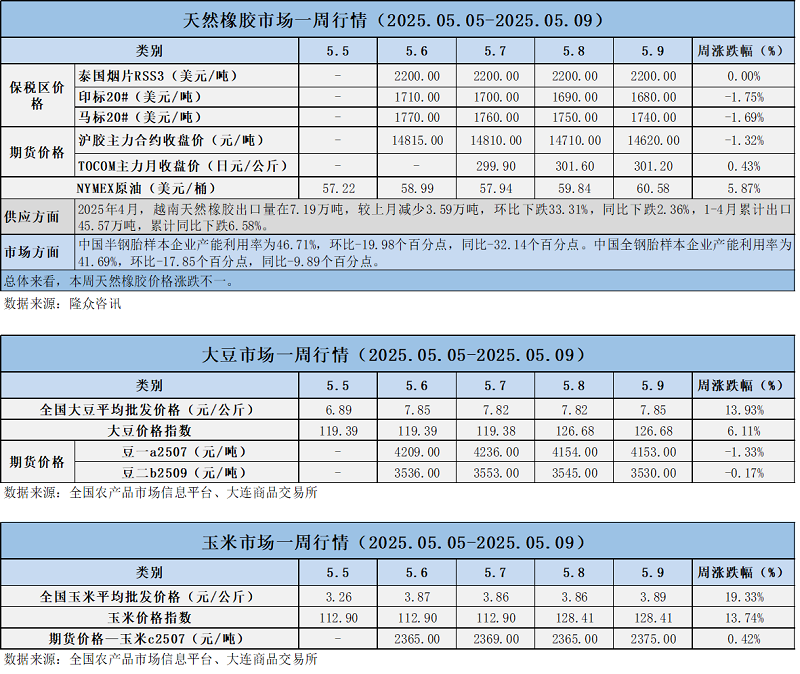 天然橡膠、大豆、玉米市場一周行情(2025.05.05-05.09)