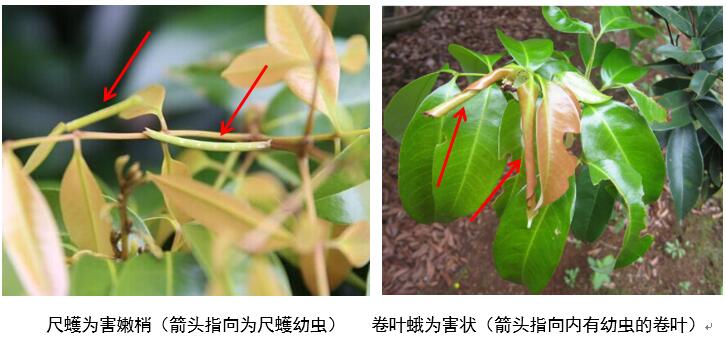 荔枝尺蠖和卷葉蛾均屬鱗翅目的蛾類,成蟲通常在5cm左右長荔枝嫩梢葉片上產(chǎn)卵,卵孵化后幼蟲咬食嫩梢嫩葉,隨著幼蟲齡期的增長,其食量逐漸加大,嚴重時整株枝嫩葉被食光。因此,在新梢長5cm左右和第1—2復葉張開前,是噴藥防治的最佳時期。