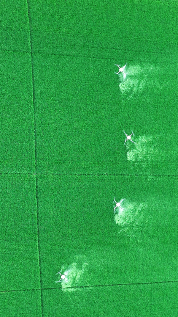 東風湖農(nóng)場采取植保無人機編隊協(xié)同作業(yè)的方式,精準高效噴施混合藥劑,全面推進“一噴三防”工作。(高 原)