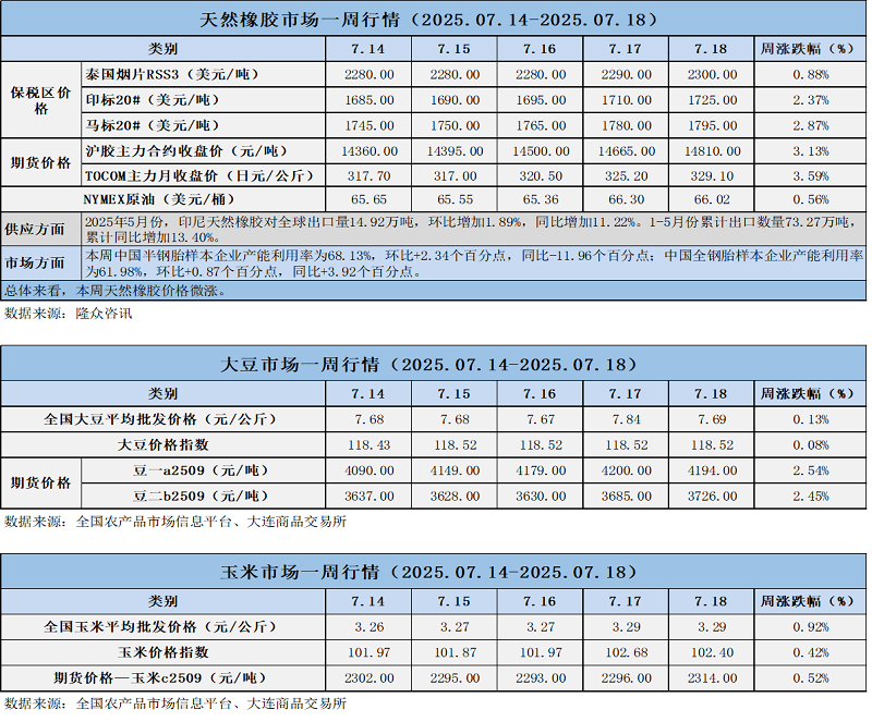 天然橡膠、大豆、玉米市場一周行情(2025.07.14-07.18)
