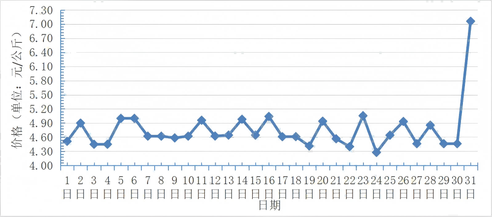 10月,全國重點監(jiān)測農(nóng)產(chǎn)品批發(fā)市場香蕉總交易量達2.3萬噸,同比基本持平,環(huán)比上漲4.5%;總交易價值12401.1萬元,同比下降19.2%,環(huán)比下降0.9%。日平均價格最高為7.0元/千克,最低為4.3元/千克,全月平均價格為 4.8元/千克,同比下降30.4%,環(huán)比下降4.0%(每日價格變化如圖)。
