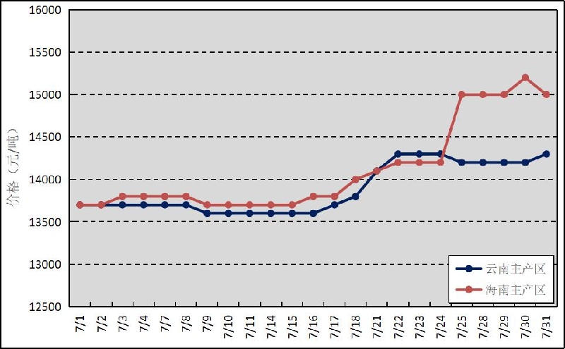 圖3 2025年7月國內(nèi)主銷區(qū)天然橡膠價(jià)格走勢(shì)