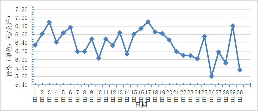 6月,全國重點(diǎn)監(jiān)測農(nóng)產(chǎn)品批發(fā)市場香蕉總交易量達(dá)2.1萬噸,同比下降4.5%,環(huán)比下降12.5%;總交易價(jià)值12270.1萬元,同比上漲6.9%,環(huán)比下跌19.9%。日平均價(jià)格最高為6.9元/千克,最低為5.6元/千克,全月平均價(jià)格為6.4元/千克,同比上漲10.3%,環(huán)比下跌7.2%(每日價(jià)格變化如圖)。