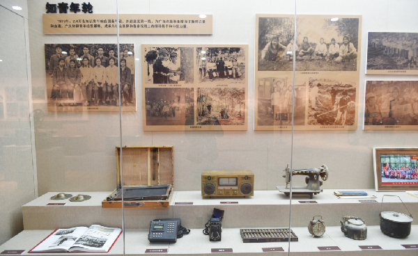 “憶往昔/崢嶸歲月”展廳。主要以廣西農(nóng)墾發(fā)展歷程為主線,展示了廣西農(nóng)墾自1951創(chuàng)建至2015年期間,在種植橡膠、安置歸僑及庫區(qū)移民、社會事業(yè)、體制改革和產(chǎn)業(yè)發(fā)展等方面的崢嶸歷史以及取得的輝煌成就。在新中國成立之初,為了打破美帝國主義對我國的經(jīng)濟封鎖和禁運,解決橡膠的生產(chǎn)供應問題,黨中央做出“在華南地區(qū)建立天然橡膠生產(chǎn)基地”的重大決策,1951年10月,廣西在省農(nóng)林廳設(shè)立墾殖處,專管廣西的植膠工作,廣西農(nóng)墾由此走上歷史舞臺。這一篇章的“農(nóng)墾大家庭”講述了軍墾、知青、歸僑、移民在農(nóng)墾屯墾戍邊、種植橡膠、發(fā)展生產(chǎn)等艱苦創(chuàng)業(yè)故事。“產(chǎn)業(yè)奠基”部分講述了20世紀60年代,廣西農(nóng)墾除橡膠主業(yè)外,開展多種經(jīng)營,建立了一批豬場、糖廠、水果加工廠等工業(yè)項目,進入了農(nóng)墾發(fā)展工業(yè)的初創(chuàng)階段,建立了廣西第一個機械農(nóng)場、第一個奶牛場、第一家淀粉廠等,還生產(chǎn)出了廣西第一瓶走進人民大會堂的礦泉水——“茶花山”礦泉水?!绑w制創(chuàng)新”部分則講述了十一屆三中全會后,廣西農(nóng)墾通過全面推行農(nóng)工商綜合經(jīng)營,興辦職工家庭農(nóng)場等形式,改變了當時農(nóng)場單一經(jīng)營農(nóng)業(yè)格局和企業(yè)統(tǒng)收統(tǒng)支的財務管理體制,并將墾區(qū)的優(yōu)勢產(chǎn)業(yè)資源進行整合,相繼組建了糖業(yè)、畜牧、劍麻等六大產(chǎn)業(yè)集團,興辦了一批產(chǎn)業(yè)園區(qū),積極向集團化、公司化轉(zhuǎn)變,為廣西農(nóng)墾集團打造現(xiàn)代一流食品企業(yè)奠定了堅實基礎(chǔ)?!吧鐣敗辈糠?,講述廣西農(nóng)墾承擔的教育、醫(yī)療衛(wèi)生、人民武裝等社會職能,在保障和改善民生方面做了大量的工作的同時,積極發(fā)揮安邊固疆穩(wěn)定器的作用,在1979年對越自衛(wèi)還擊戰(zhàn)中,邊境農(nóng)場有上萬名民兵支前參戰(zhàn),有21個單位和181人立功獲獎;隨著中央關(guān)于剝離企業(yè)社會職能工作的不斷推進,除了廣西職業(yè)技術(shù)學院這所公辦高校被保留至今,其他社會職能都已先后從農(nóng)墾剝離出去。