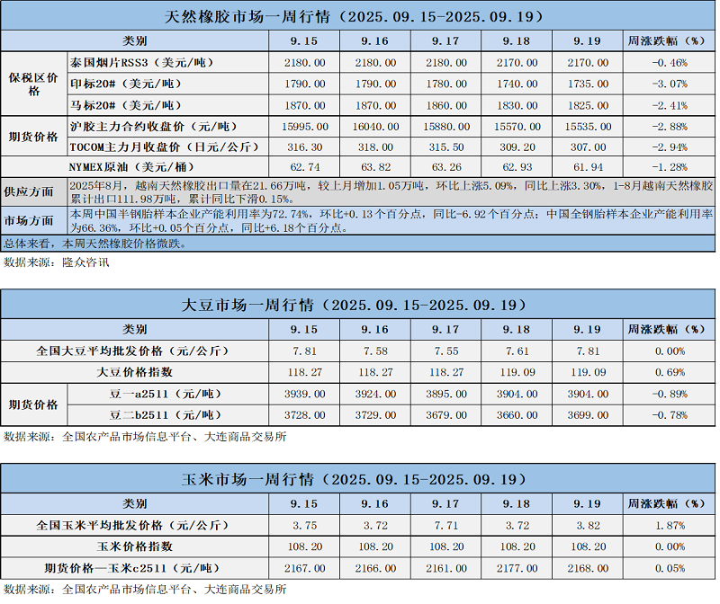 天然橡膠、大豆、玉米市場(chǎng)一周行情(2025.09.15-09.19)