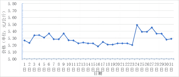 3月,全國重點監(jiān)測農(nóng)產(chǎn)品批發(fā)市場香蕉總交易量達2.7萬噸,同比下降3.6%,環(huán)比增長42.1%;總交易價值14303.7萬元,同比下降27.7%,環(huán)比增長43.48%。日平均價格最高為5.5元/千克,最低為5.2元/千克,全月平均價格為5.3元/千克,同比下降17.2%,環(huán)比基本持平(每日價格變化如圖)。