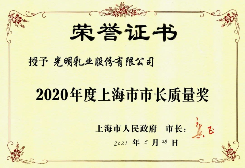 今天,在2021年度上海市質(zhì)量工作會議上頒發(fā)了2020年度上海市政府質(zhì)量獎,光明乳業(yè)股份有限公司榮獲本市最高質(zhì)量榮譽——2020年度上海市市長質(zhì)量獎(組織),成為了該獎項自2008年設(shè)立以來首家獲獎的食品企業(yè)。