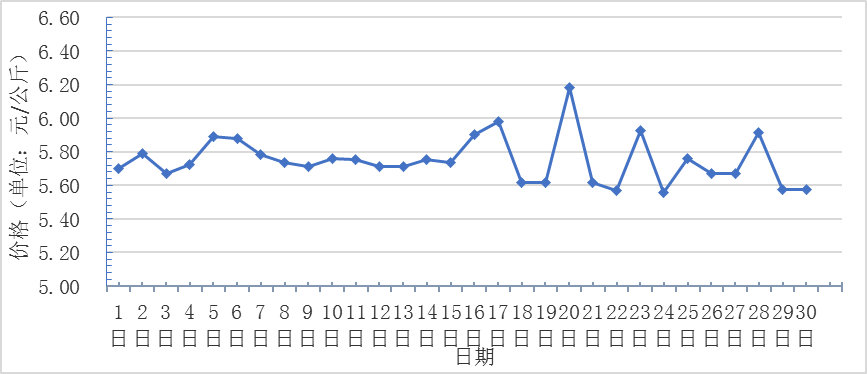 6月,全國(guó)重點(diǎn)監(jiān)測(cè)農(nóng)產(chǎn)品批發(fā)市場(chǎng)香蕉總交易量達(dá)2.2萬(wàn)噸,同比下降4.3%,環(huán)比下降15.4%;總交易價(jià)值11480.5萬(wàn)元,同比下降25.2%,環(huán)比下降12.4%。日平均價(jià)格最高為6.2元/千克,最低為5.6元/千克,全月平均價(jià)格為 5.8元/千克,同比下降13.4%,環(huán)比上漲11.5%(每日價(jià)格變化如圖)。