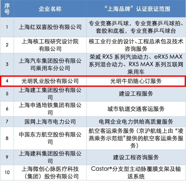 “上海品牌”以世界先進(jìn)標(biāo)準(zhǔn)為引領(lǐng),以此推進(jìn)“上海服務(wù)、上海制造、上海購(gòu)物、上海文化”四大領(lǐng)域建設(shè),并以此構(gòu)建更高質(zhì)量、高要求的市場(chǎng)要求。2018年光明乳業(yè)首次通過(guò)認(rèn)證,成為首家以食品通過(guò)認(rèn)證的企業(yè),2022年光明牛奶隨心訂服務(wù)再創(chuàng)佳績(jī),榮耀繼續(xù)。