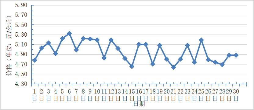 9月,全國(guó)重點(diǎn)監(jiān)測(cè)農(nóng)產(chǎn)品批發(fā)市場(chǎng)香蕉總交易量達(dá)2.2萬噸,同比上漲4.80%,環(huán)比下降4.3%;總交易價(jià)值12518.2萬元,同比下降9.1%,環(huán)比上漲6.1%。日平均價(jià)格最高為5.3元/千克,最低為4.7元/千克,全月平均價(jià)格為 5.0元/千克,同比下降25.4%,環(huán)比基本持平(每日價(jià)格變化如圖)。