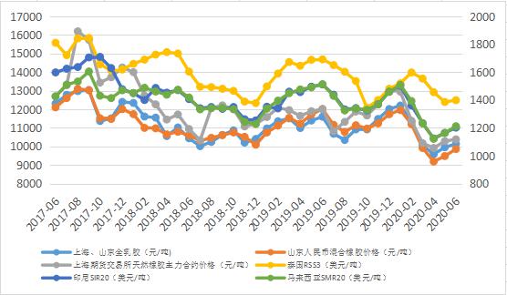 上半年天然橡膠市場價(jià)格總體處于低位。1-4月,受新冠肺炎疫情影響,市場交易低迷,價(jià)格下行,月均價(jià)環(huán)比跌幅最高達(dá)22.9%;5-6月,產(chǎn)業(yè)上下游復(fù)工復(fù)產(chǎn),全球貿(mào)易逐步恢復(fù),各國出臺刺激政策提振經(jīng)濟(jì),價(jià)格震蕩回調(diào),月均價(jià)環(huán)比止跌回正,最高至3%-4%。上半年現(xiàn)貨國內(nèi)市場全乳膠上海、山東市場均價(jià)每噸10423元,同比跌7.7%;混合膠山東市場均價(jià)每噸10151元,同比跌12.8%?,F(xiàn)貨東南亞市場,泰國RSS3均價(jià)每噸1475美元,同比跌9.5%;印尼SIR20均價(jià)每噸1249美元,同比跌13.9%;馬來西亞SMR20均價(jià)每噸1251美元,同比跌13.4%。期貨市場上期所主力合約均價(jià)每噸10769元,同比跌9.5%。